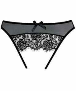 Hidden desires revealed in this seemingly secretive sheer mesh crotchless panty, with eyelash lace caressing the ouverte derriere. That it is topped with a bow is a wink of sweet, sprinkled over a flow of naughty.