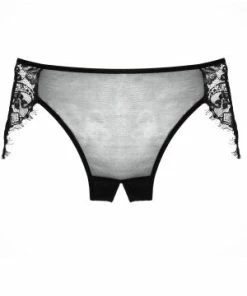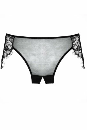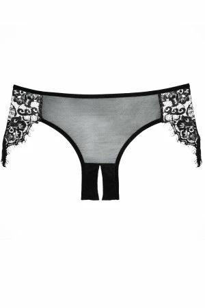 Dreamy crotchless mesh panty with luscious kisses of wispy eyelash lace on the hips.
