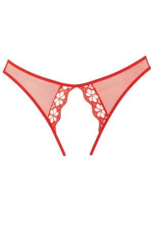 A mélange of sheer mesh and flower lace with picot trim, makes this panty with peekaboo cut outs in front and back, deliciously naughty.