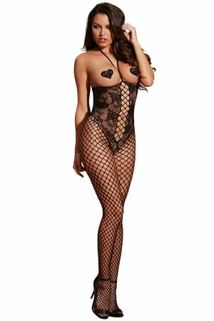 Open-cup bodystocking with knitted lace “teddy” design, fishnet legs, open crotch and adjustable halter ties. (Pasties not included.)