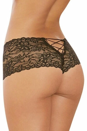 Release your inner seductress in this sexy stretch lace short. The sheer lace short features a naughty open crotch and a seductive lace up detail in back. These sultry shorts are made out of stretch lace fabric that hugs your body.