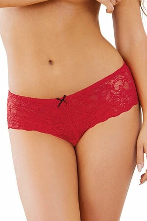 These ruby open crotch shorts are made of stretch lace and have a satin bow detail.