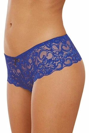 These sapphire open crotch shorts are made of stretch lace and have a satin bow detail.