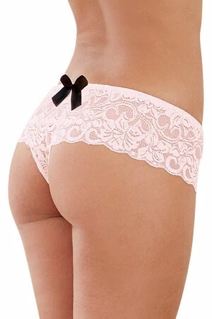 Stretch lace, open-crotch, cheeky boyshort with satin bow details.