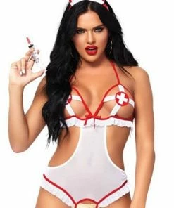 This sexy naughty night nurse costume features a crotchless teddy with peek-a-boo cups, tie back and matching hat headband.