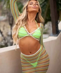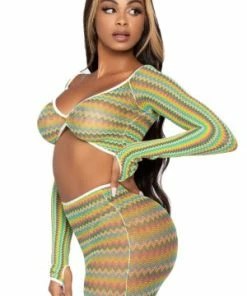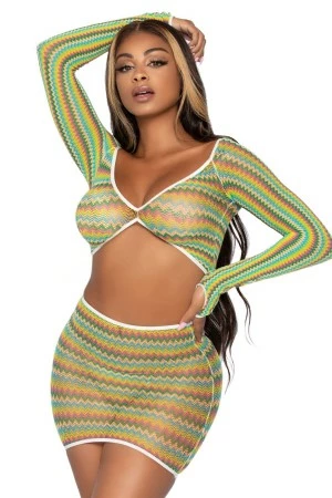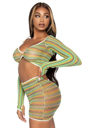 Go bold in this 2 PC lingerie set by Leg Avenue, featuring a zig zag net crop top with sultry deep-v neckline and gauntlet sleeve, eye catching contrast color trim, and matching mini skirt. Sexy and versatile, this set is perfect in the bedroom, pool side as a swimsuit cover-up, or fun festival outfit (panty not included).