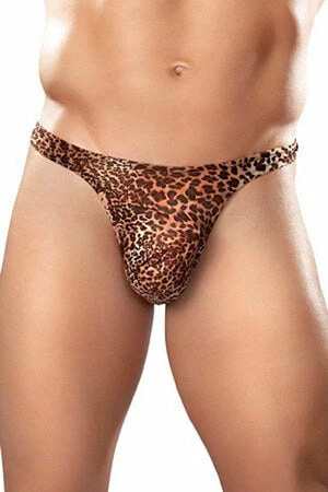 Brown leopard print thong which features a spacious pouch and covered elastic waistband.