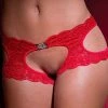 Nothing comes between you and your pleasure with this sexy lace thong. This low rise crotchless black lace V shaped thong features wide sides for comfort and fit. Made of stretchy 85% nylon, 10% rayon, 5% spandex fabric.