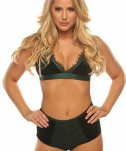 Be a Vixen in this sexy set featuring an emerald color velvet bralette with soft cups, eyelash lace trim, adjustable straps, hook and eye back closure and a matching high waisted panty with a lace front insert.