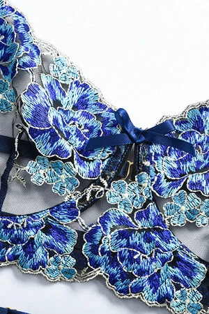 This Floral Desire set includes a beautiful mesh bra with underwire featuring floral embroidery in blues and ivory and adjustable back straps. Set also includes a match G-String and Garter belt.