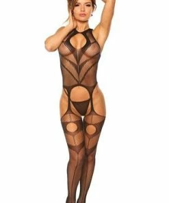 This seductive suspender bodystocking features a high neck with keyhole, low cut back, faux garter suspenders, attached thigh highs with front and back keyhole detailing.