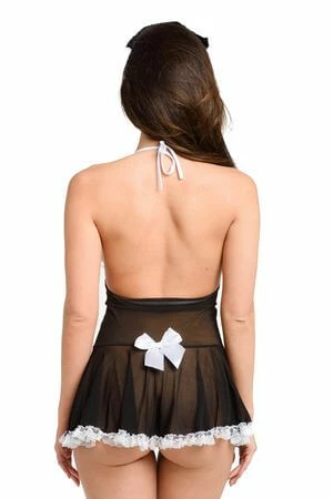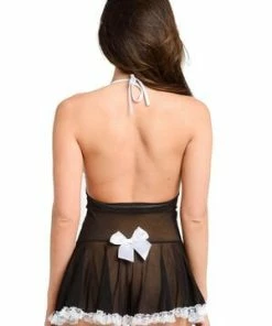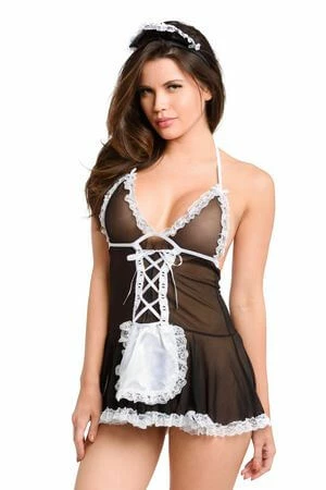 Babydoll features a sheer mesh bodice, lace-up front detail, attached apron, triangle cups with ruffled lace trim, halter neck ties, open back, ruffled lace hem, g-string, and a matching maid headband. **Sizing Note – One Size should work for you, if you normally wear XS, SM, MED, and sometimes LG.