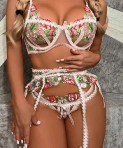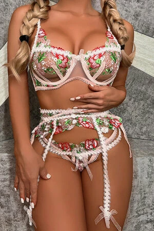Sweetest Floral set includes bra with sheer mesh featuring floral embroidery, ricrac trim, adjustable straps and back closure. Set also includes matching G-String and garter belt.