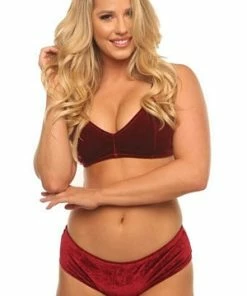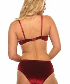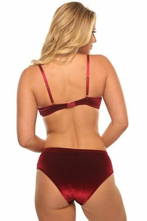 Our elegant Velvet Kiss bra set features a wine colored soft cup bralette with adjustable straps, hook back closure and matching panty.